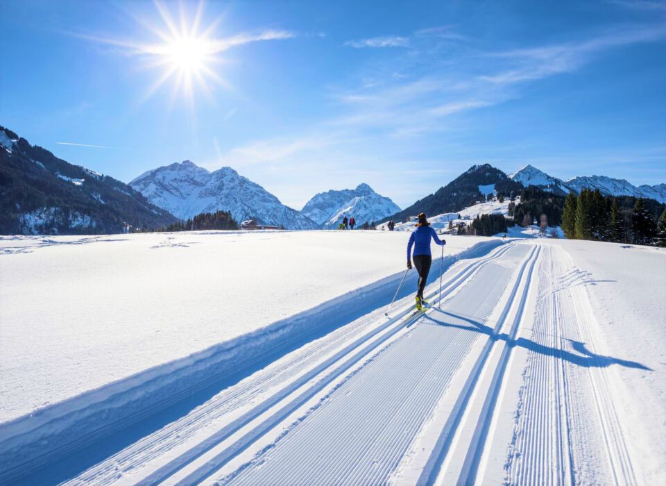Did you know: Cross-country skiing takes you to places in Kleinwalsertal that are inaccessible on foot! You will find magical silence there. Whether ice skating or classic cross-country skiing, both wishes are fulfilled in the 50 km long network of trails. The three routes Steinbock Loipe, Schwende Loipe and Küren-Wäldele-Egg are also essential trails of the Walser Omgang. Never balanced on narrow planks before? No worries, cross-country skiing is easier than it looks. Even beginners are soon guaranteed to ski on the trail after a cross-country skiing course with a ski instructor! All cross-country skiing equipment is available for hire at the sports shops in the village.